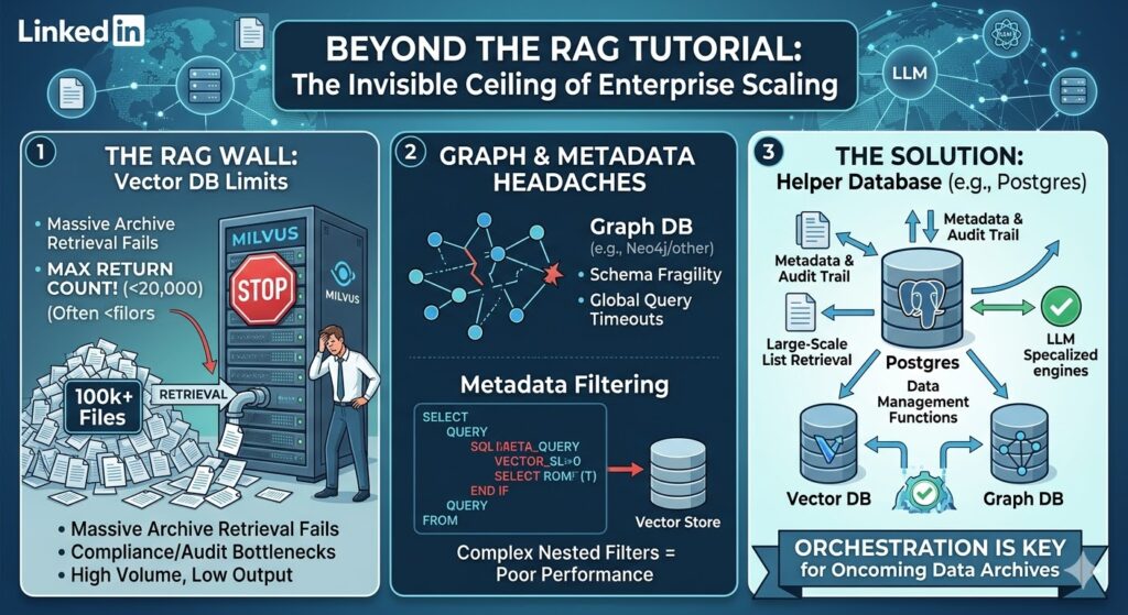 The hard lesson I’ve learned is that an enterprise RAG system is not just a vector store; it is a coordinated data architecture. You cannot rely on your vector or graph DB to be the “source of truth” for your metadata or your large-scale retrieval logic.